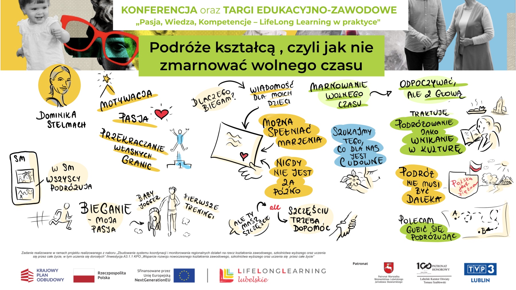 Podczas wystąpień i paneli rysunek stawał się drugim głosem obok mówców. Kiedy Piotr Wasyluk mówił o szkole projektowanej jak usługa, moja notatka pokazała proces design thinking w obrazach, które były zrozumiałe dla każdego. Gdy Dominika Stelmach opowiadała o podróżach i bieganiu, rysunek zamienił jej słowa w wizualną opowieść o przekraczaniu granic.