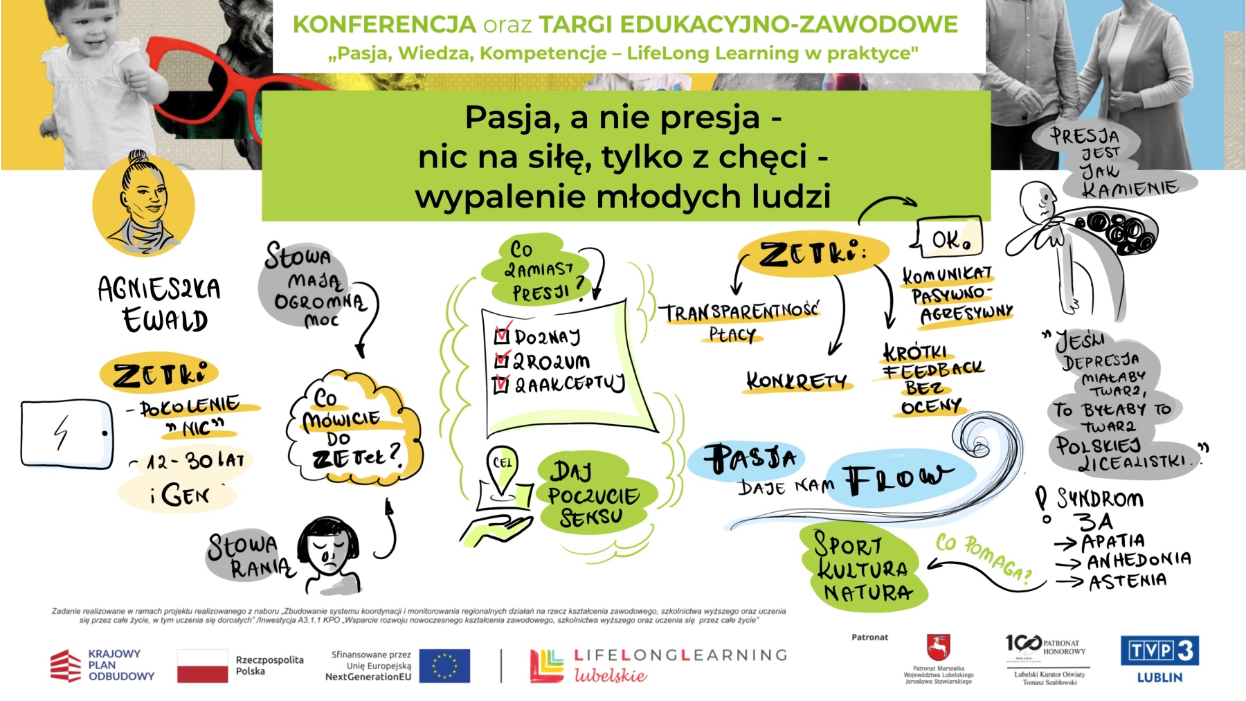 A kiedy Agnieszka Ewald mówiła o wypaleniu młodych ludzi, notatka pokazała nie tylko fakty, ale też emocje – ciężar presji i siłę pasji, która może być antidotum. Właśnie dlatego sketchnoting na wydarzeniu to nie tylko dokumentacja, ale też interpretacja, która dodaje warstwę emocji i obrazów do samych treści.