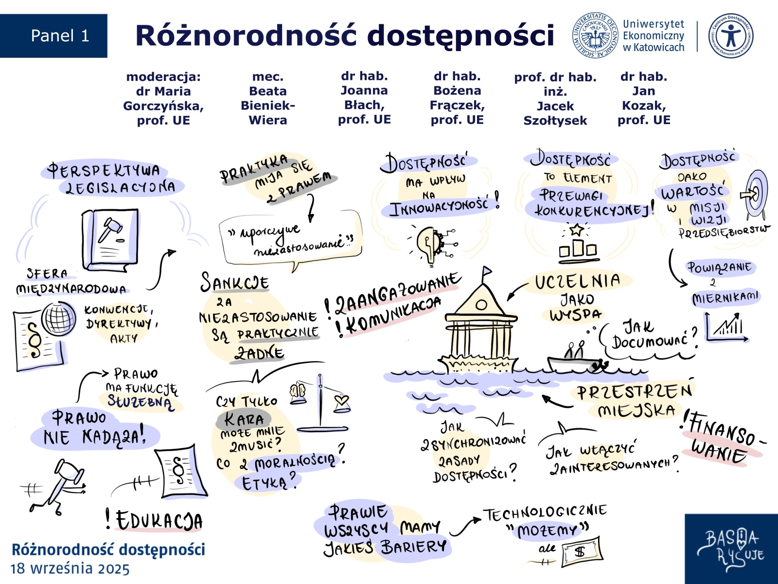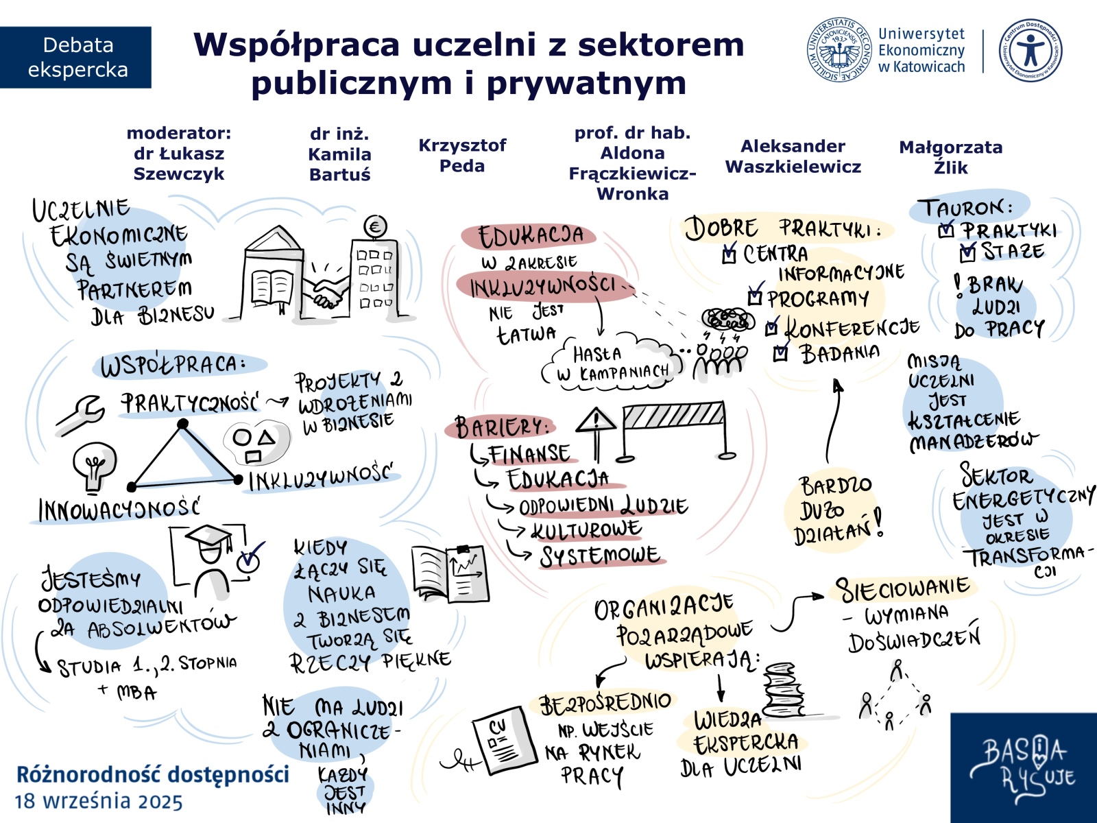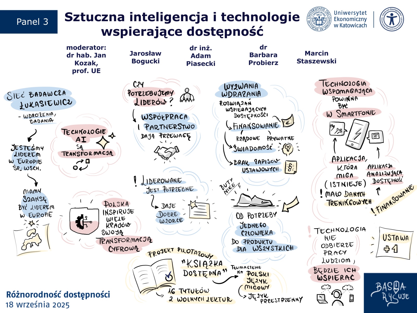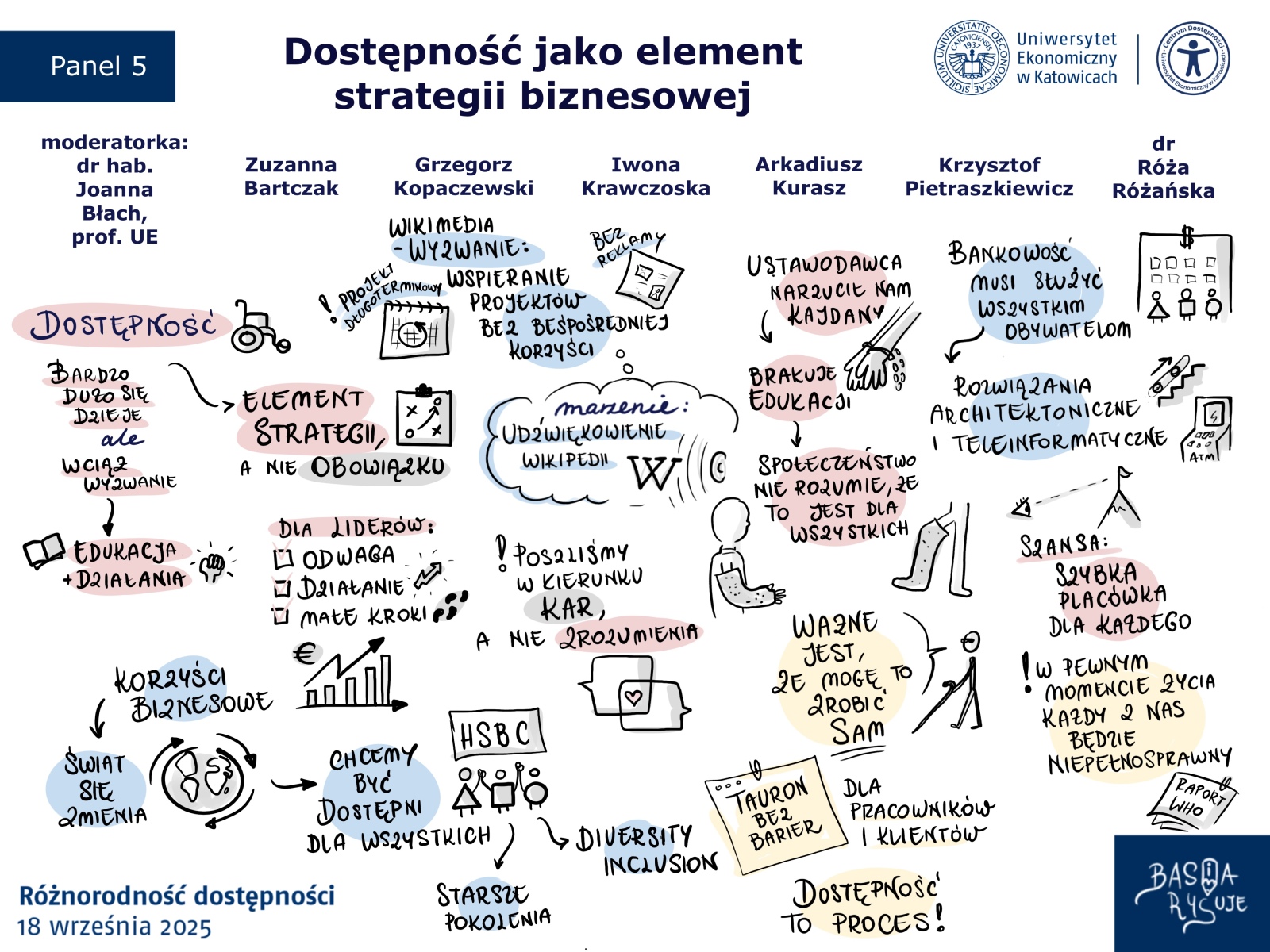 Zamiast klasycznej prezentacji czy surowych slajdów, uczestnikom towarzyszyły uproszczone notatki wizualne. Tworzone na żywo, w rytmie wystąpień. Dzięki nim treści zyskały lekkość i strukturę, a skomplikowane zagadnienia dotyczące dostępności stawały się bardziej zrozumiałe i bliskie. Każda linia, symbol i kolor miały swój cel: pomóc uczestnikom zobaczyć sens rozmowy, a nie tylko go usłyszeć.