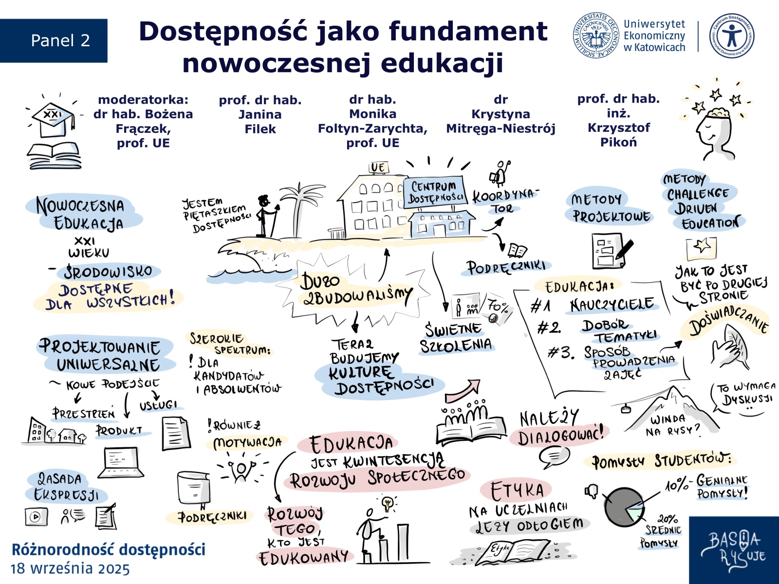 Po zakończeniu konferencji stworzyłam także duży plakat podsumowujący całe wydarzenie. To swoista mapa wniosków, emocji i idei, które pojawiły się podczas rozmów. Plakat stał się pamiątką konferencji. Może zawisnąć na ścianie uczelni lub w przestrzeni biurowej, przypominając o wartościach, które powinny przyświecać każdej instytucji mówiącej o dostępności.